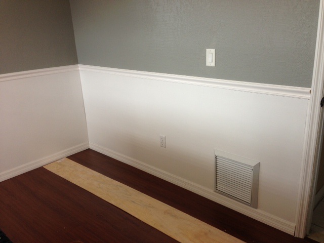 My wife requested a chair rail to be put in to separate the pink paint (bottom) with the white (top).